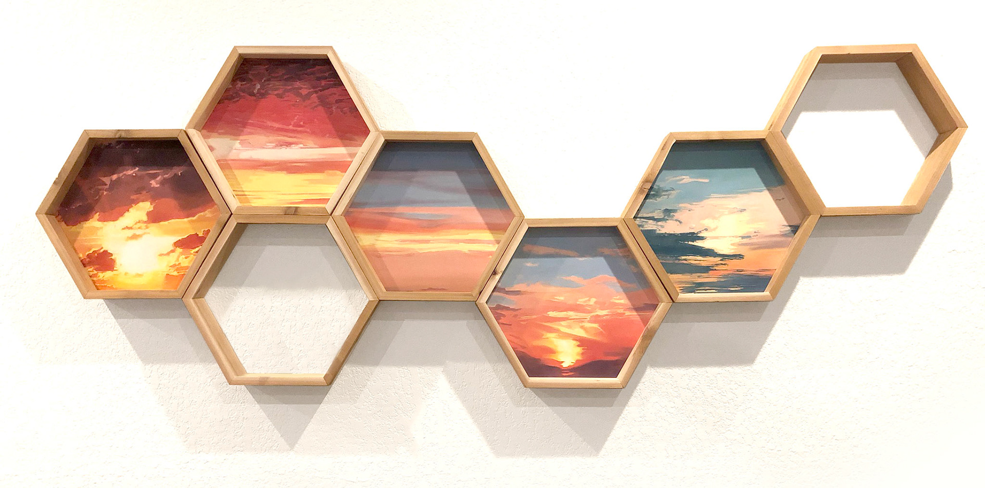, oil on wood panel in Cedar Frames (each hexagonal panel is 18"x22", 2019