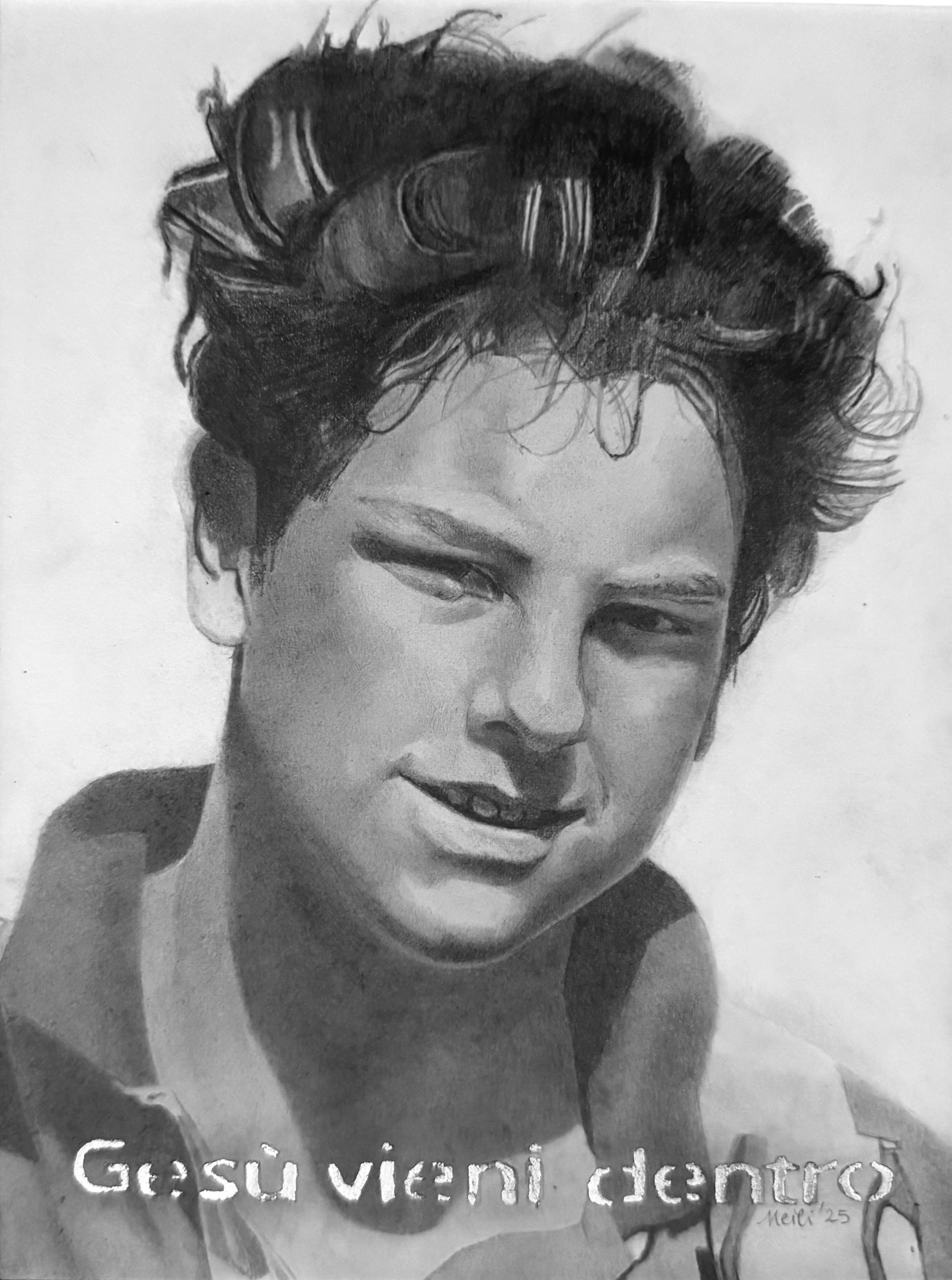 St Carlo Acutis, 9"x 12", graphite on paper with gold leaf lettering, 2025.